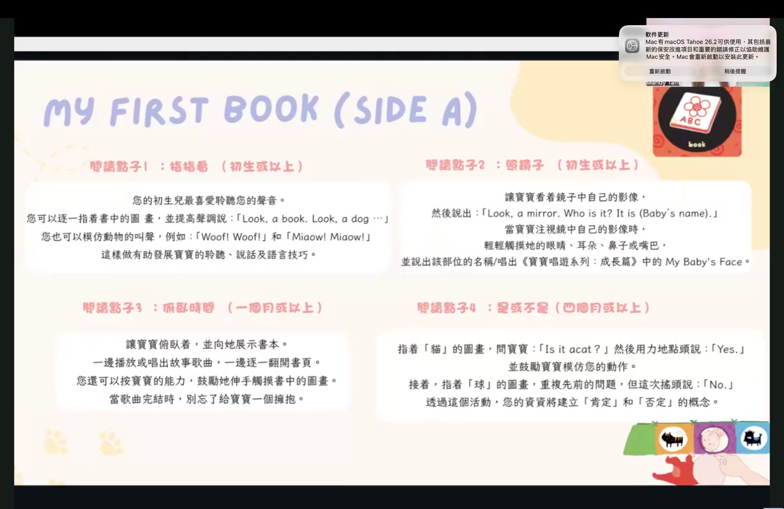 讓寶寶觸摸書本,家長一邊播/唱故事歌,一邊翻頁。