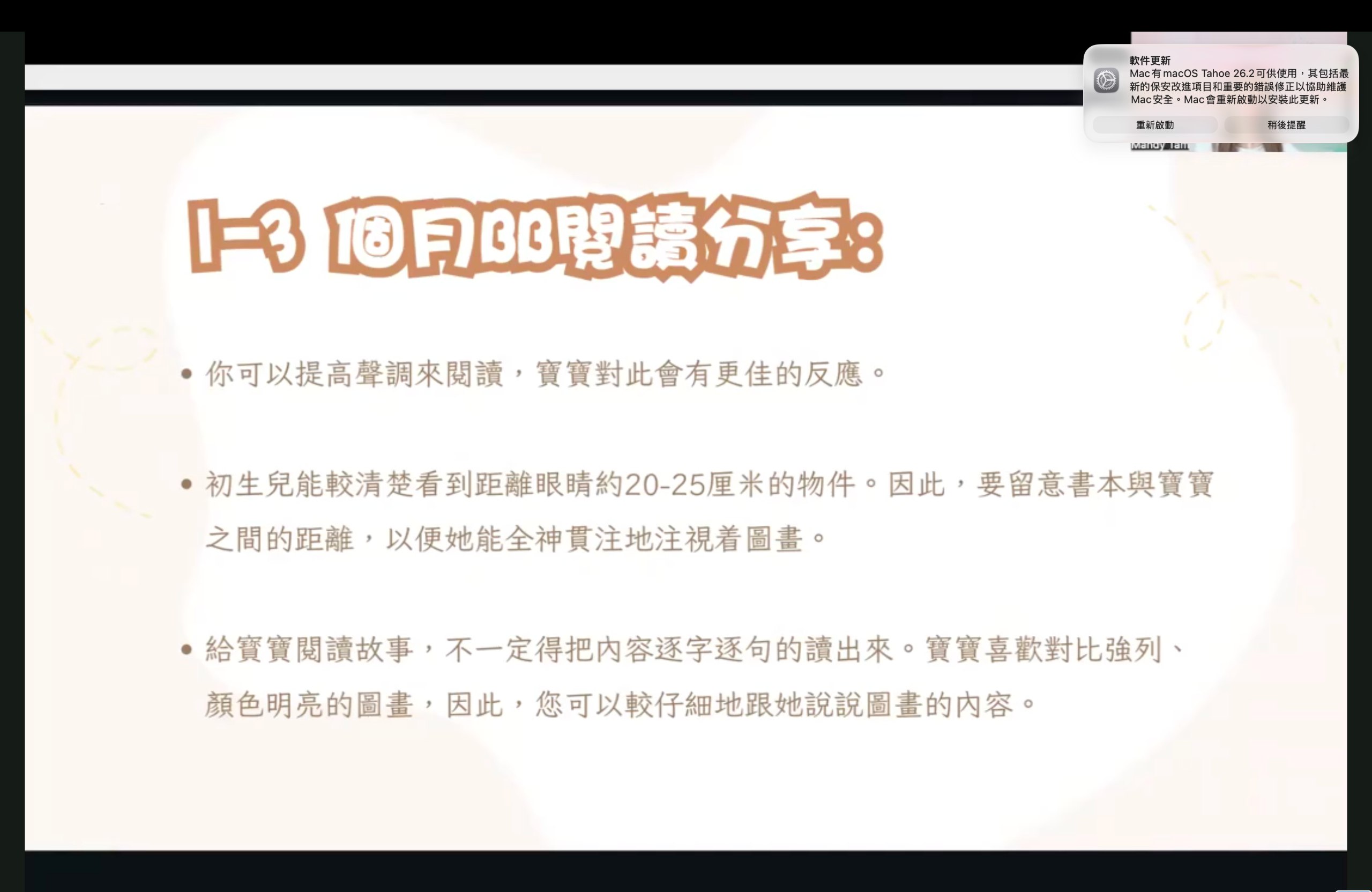 同寶寶閱讀故事,不一定要逐字逐句讀出;寶寶喜歡對比強烈、顏色明亮的圖畫,所以可以較仔細講解圖畫內容。
